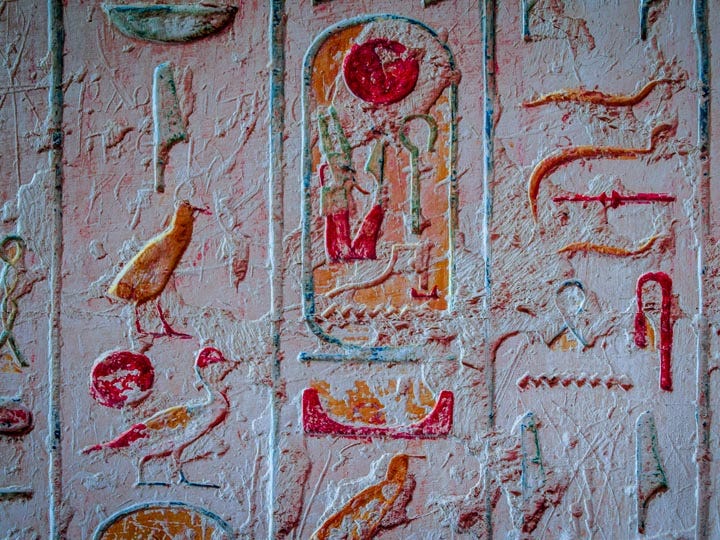 Fast forward a few hundred thousand years from the time of the first ochre production in Africa, the ancient Egyptians were still using ochre, amongst other pigments, to imbue their art with color and life. By this time, humans had refined their use of art to the highly symbolic transmission of idea: the written word. Hieroglyphs were used as a way to convey ideas and to cement them in the material world with their physicality. Łukasz Byrski writes in his paper Identifying the Magical Function of Script in Ancient Cultures ‒ a Comparative Perspective (warning pdf link):