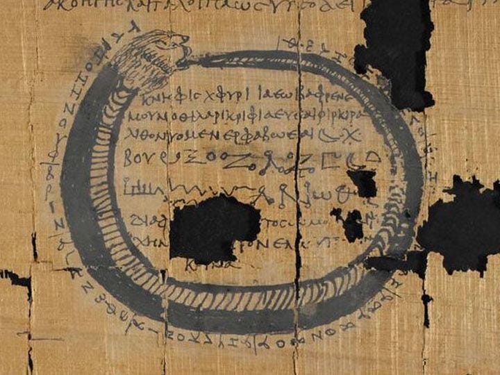 Here we see a cultural recognition of the creational aspect of the hieroglyphs. They are treated as potent forces for change on their own, for both good or bad depending on the powers invoked through each individual sign. Art, through pictorial representation of the spoken word, was richly integrated, and often synonymous with magick. By the Hellenistic era (about 300 BCE—250 CE), a thriving trade in magical amulets, scrolls and other objects colored the spiritual landscape. Our best example of magic from this period is the Papyri Graecae Magicae, or PGM (pdf of document).