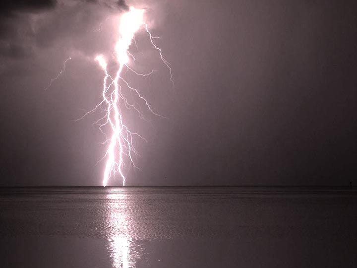 When I was a kid, my parents liked to take us down to the beach when there was a storm coming in. I remember the feeling of wind on my face, of awe mingled with a little bit of terror. There is something surreal in the way the giant arcs of lighting crossed the sky and ocean, followed by the rolling thunder and the crashing waves. The storms always seemed to come in around sunset, so the sky would be a glorious mix of storm and sinking light, a few bright stars beginning to appear. There wasn’t really any conversation during these trips, just the silent adoration of nature. The joy of witnessing the approaching power of the storm and sea is a strange and magical feeling. Even to this day, many years later, I recall that visceral feeling of raw elemental glory with a certain joie de vivre.