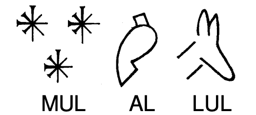 Mul signified the starry nature of a constellation, the Al sign depecting a hoe or pickaxe, perhaps a reference to the digging aspect of a crab. The Lul sign is pictorially like that of a fox’s head, and was the primary element used in the name of the Fox Star or the False Star, a title that referred to Mars. From page 104 of the book Babylonian Star Lore by Gavin White: