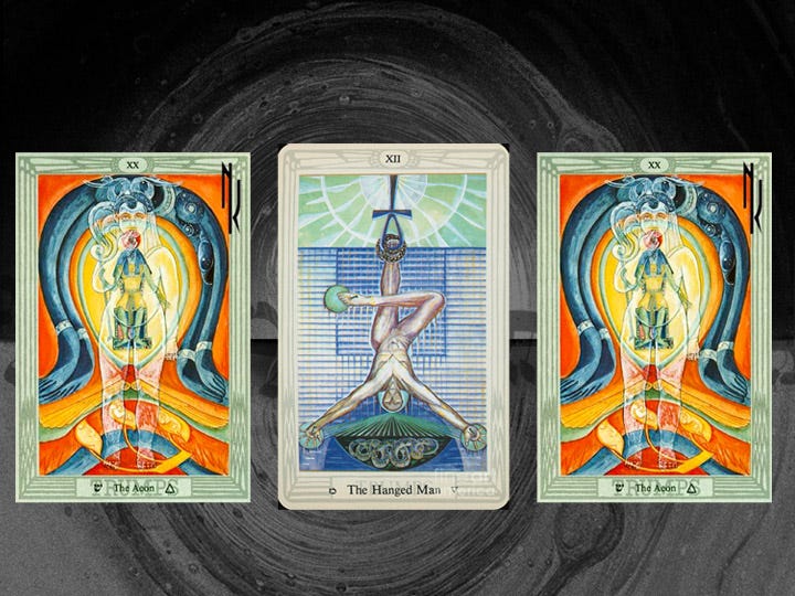 Let’s examine the solar principal of teth at work here. In astrology, the Sun represents the source of light, spirituality and the fountain of intellect in the nativity. The Sun has its joy in the ninth house, the house of religion, higher learning and philosophy. It is one of the primary sources of vitality in the natal chart. In Hebrew the Sun is called שמש, Shemesh and has the value of 640 in gematria. There are a few important aspects here, first that the spelling of the word contains the letter for elemental fire, ש, shin, enclosing the letter for elemental water, מ, mem. One could easily imagine that these shins and mems might repeat forever, משמשמשמש on and on, signifying something like a waveform fluctuation between two states, one internal and one external. If we put the corresponding tarot trumps together that spell the word, we would have the Hanged Man flanked by two Aeons. We get the sense that this is a fundamental force of nature, of contrasting between the microcosm of the Aeon and the macrocosmic introspection of the Hanged Man.