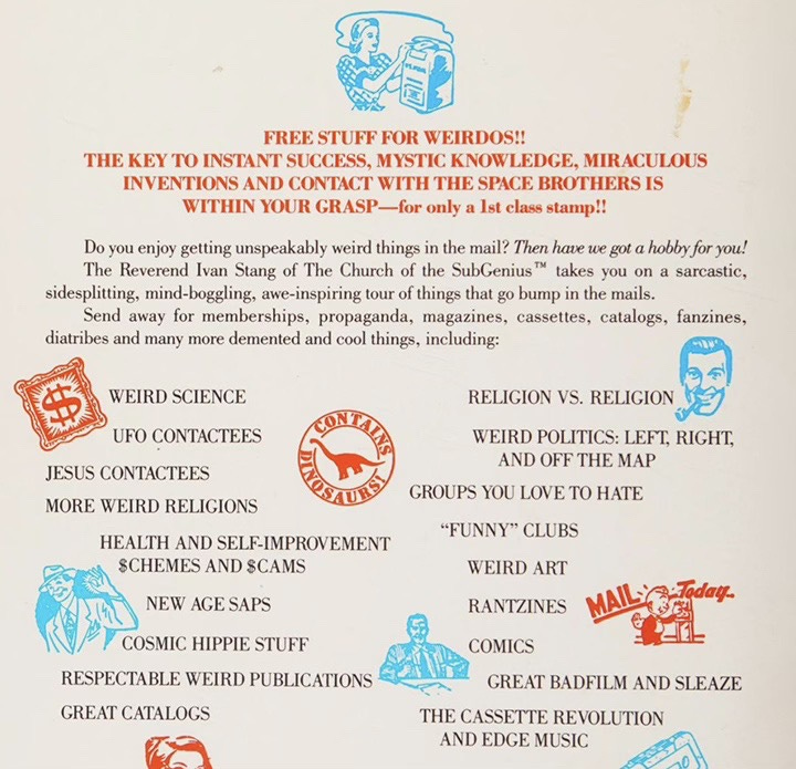 Nestled amongst the nauseating flashing pixels, one could find the remains of a variety of delightful strangeness: the Church of the SubGenius1, TOPY, Deoxy, and the Zine movement all revealed a world much different (and more interesting) than the one your regular working-class parents lived in. For the weird kids, it was like a gift from the gods to discover that there were other people out there who didn’t just settle for a life of endless mindless consumption and lack of fulfillment.